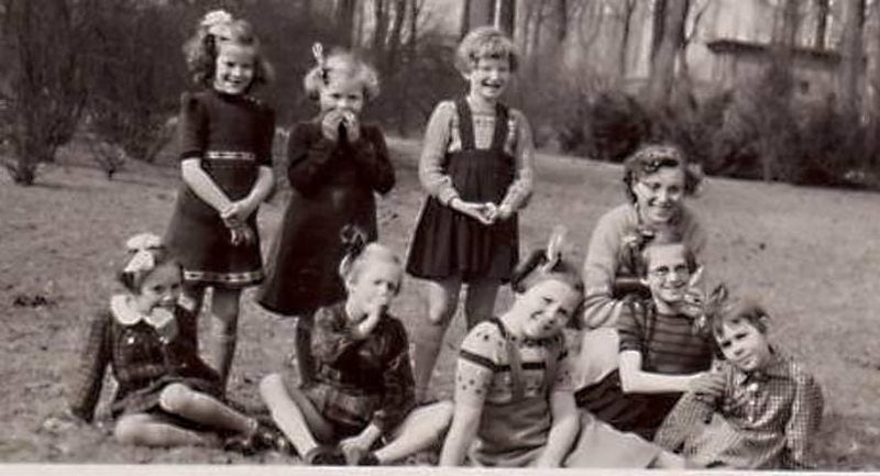 Annemie Baayens, Ineke Griffijn??, Thea Hansen, Elly Palman met een brilletje op. Wie de juf is, weet ik niet....